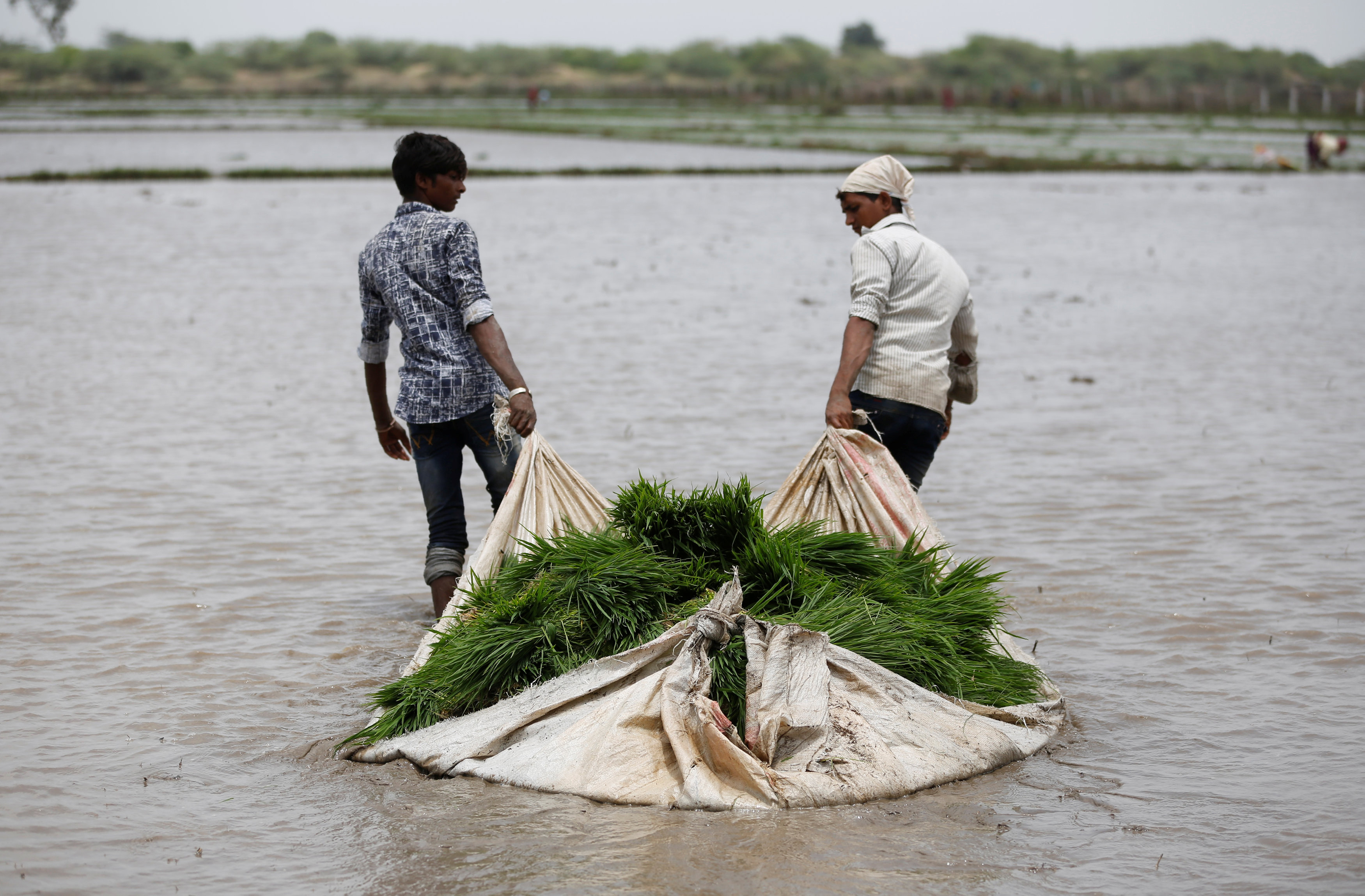 Labourers pull a plastic sheet loaded with saplings to plant them in a rice field on the outskirts of Ahmedabad, India, July 5, 2017. Photo: Reuters