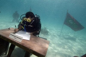 The government has arranged a horseshoe-shaped table on the seabed for the ministers, who will communicate using white boards and hand signals.