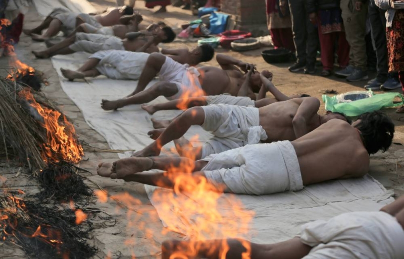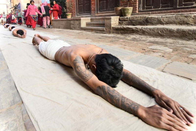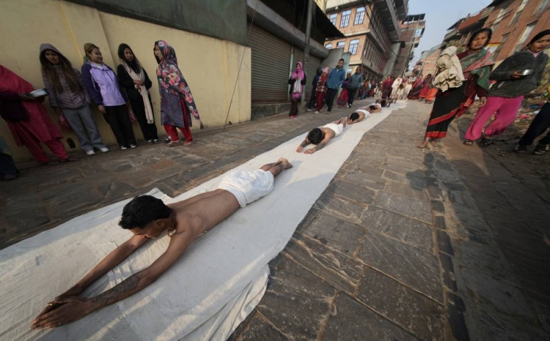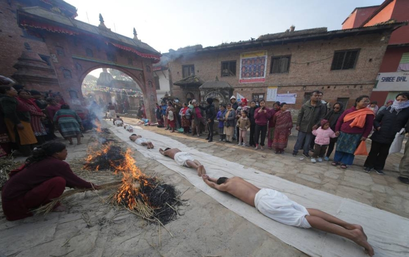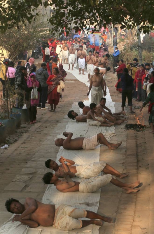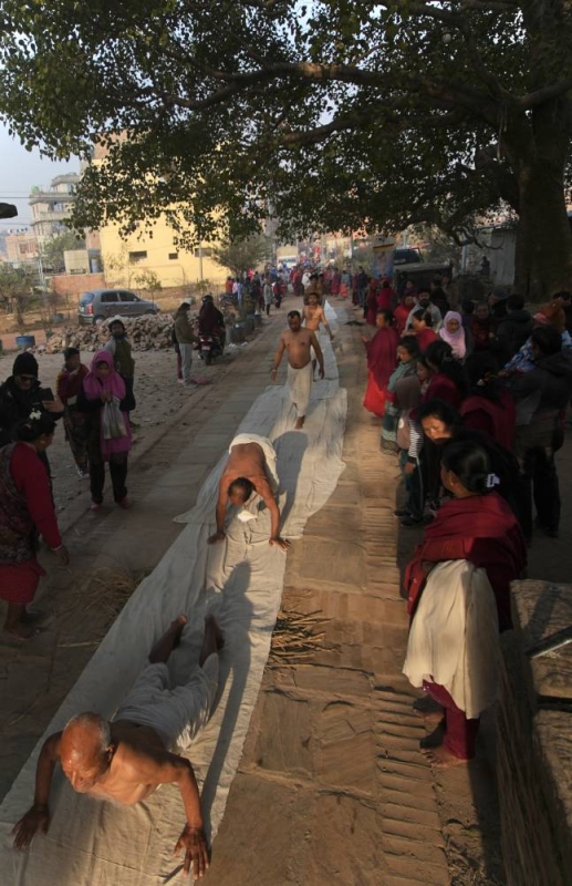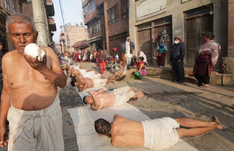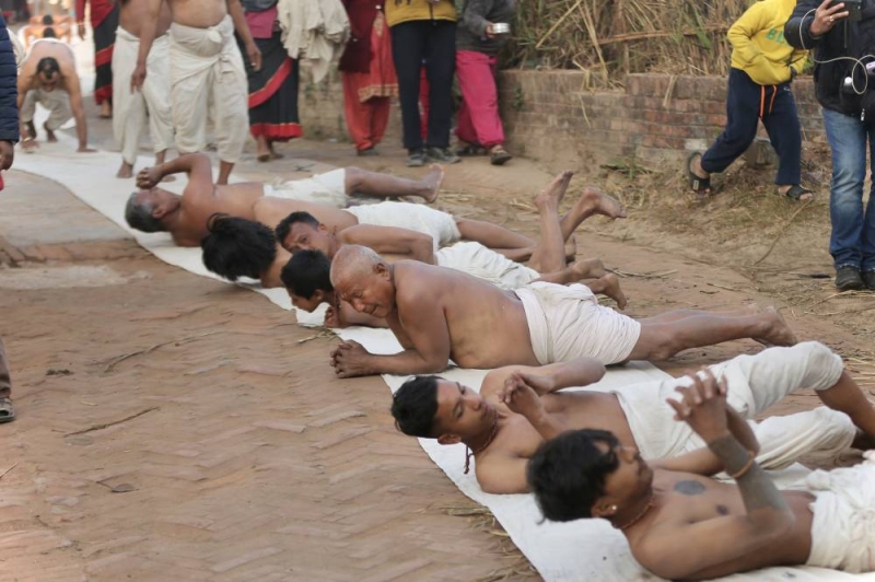 On the concluding day of the month-long Madhav Narayan Festival, devotees performed a sacred ritual of body-rolling during the circumambulation of Hanumanghat in Bhaktapur on Saturday.
