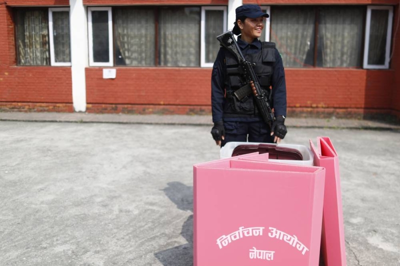 A Nepal Police personnel stands guard beside ballot boxes before they are dispatched to polling stations, a day ahead of the elections, at the Election Commission office in Kathmandu, Nepal, on Wednesday, March 4, 2026.