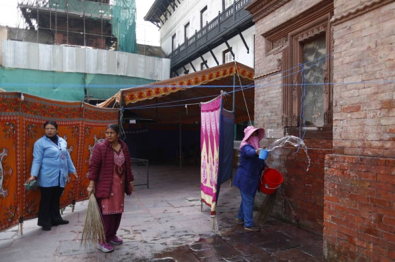 Workers clean the polling stations, a day ahead of the elections, at the Election Commission office in Kathmandu, Nepal, on Wednesday, March 4, 2026.