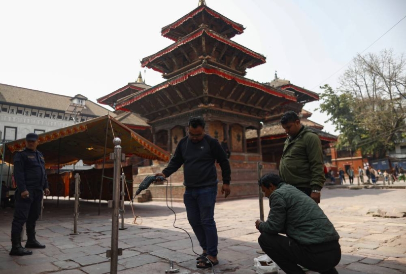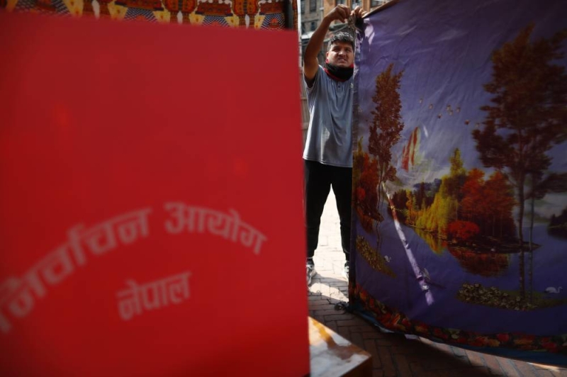 A polling station is pictured at the Basantapur Durbar Square, a day ahead of the elections, at the Election Commission office in Kathmandu, Nepal, on Wednesday, March 4, 2026.