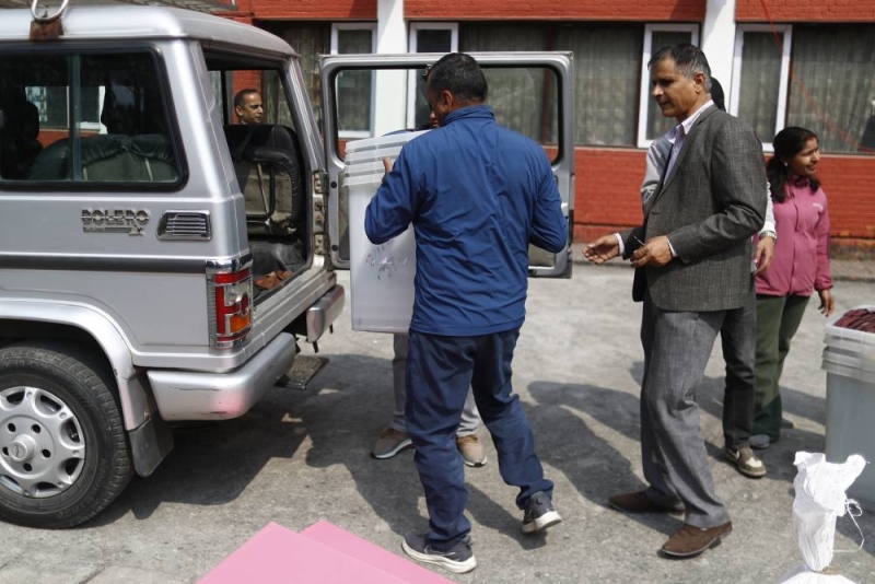 Election Commission staffers load ballot boxes before they are dispatched to polling stations, a day ahead of the elections, at the Election Commission office in Kathmandu, Nepal, on Wednesday, March 4, 2026.