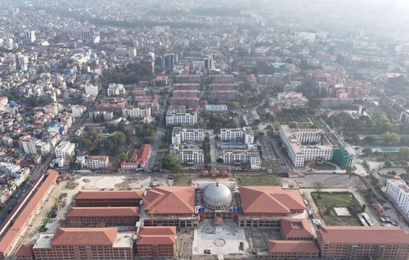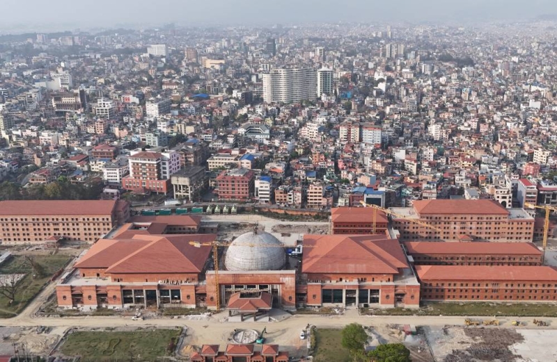 An aerial view shows Nepal’s newly under construction Parliament building after the previous Federal Parliament complex was burned during the Gen Z protests in Kathmandu, Nepal, on Saturday, March 14, 2026. The new House of Representatives is expected to convene soon as political parties finalize negotiations to form the next government and cabinet following the recent elections. Photo: Skanda Gautam/THT