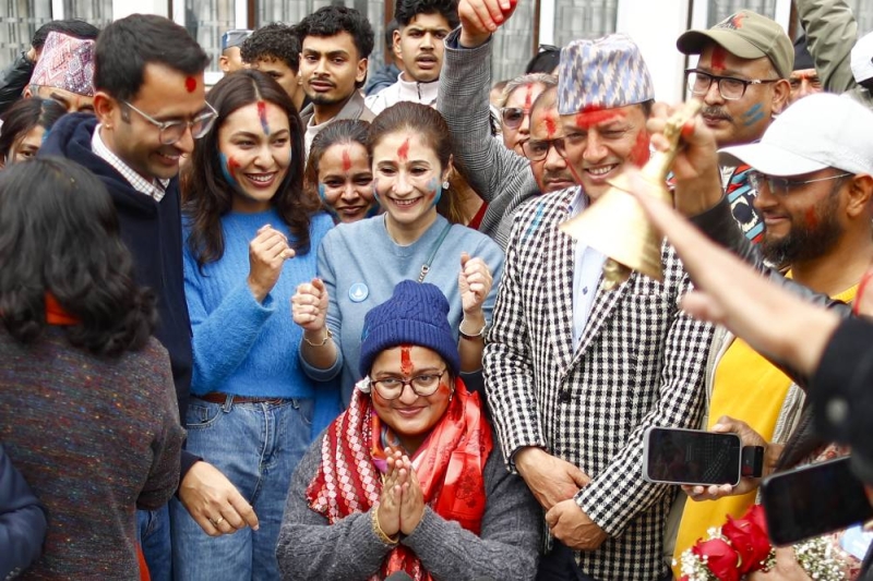 Ranju Darshana (center), candidate of the Rastriya Swatantra Party (RSP), celebrates with supporters after winning the Kathmandu-1 seat in the House of Representatives election in Kathmandu, Nepal, on Friday, March 6, 2026. Darshana secured 15,455 votes, defeating Nepali Congress candidate Prabal Thapa and Rastriya Prajatantra Party’s Rabindra Mishra, marking the first confirmed parliamentary victory for the RSP in the ongoing elections.