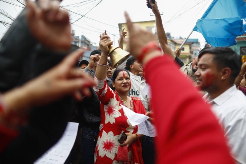 Supporters ring the party bell and celebrate after Ranju Darshana, candidate of the Rastriya Swatantra Party (RSP), wins from Kathmandu-1 election in Kathmandu, Nepal, on Friday, March 6, 2026. Darshana secured 15,455 votes, defeating Nepali Congress candidate Prabal Thapa and Rastriya Prajatantra Party’s Rabindra Mishra, marking the first confirmed parliamentary victory for the RSP in the ongoing elections.