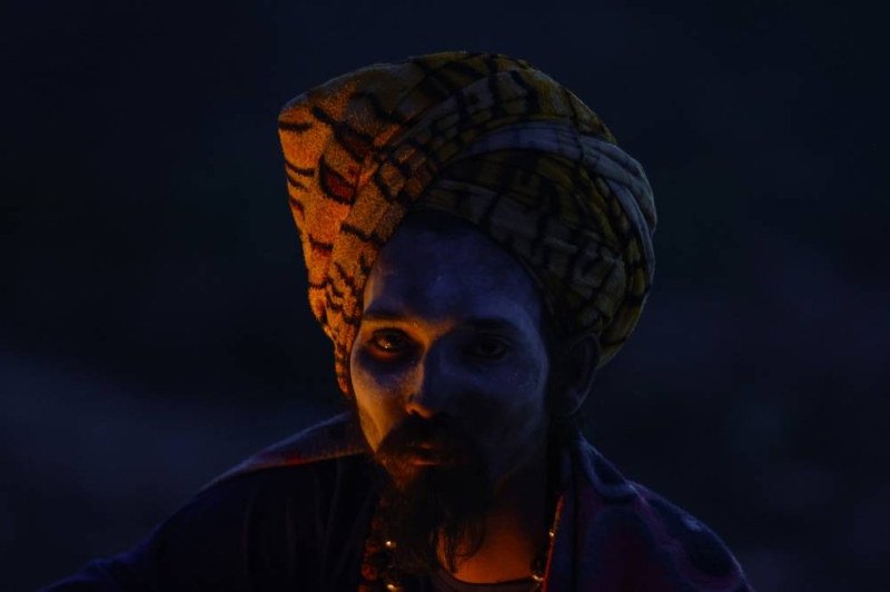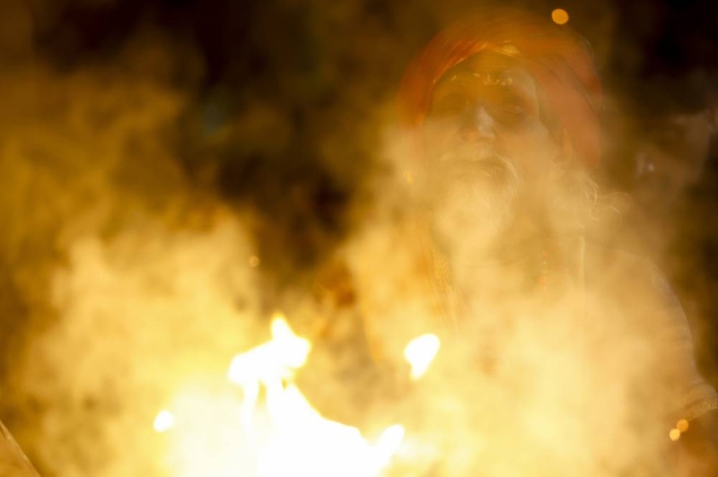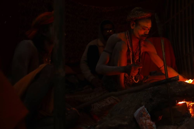 A Sadhu sits beside a fire inside the premises of the Pashupatinath Temple on the eve of the Maha Shivaratri festival dedicated to Lord Shiva in Kathmandu, Nepal, on Saturday, February 14, 2026.