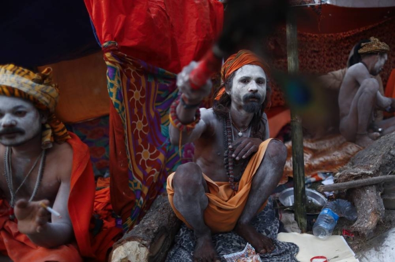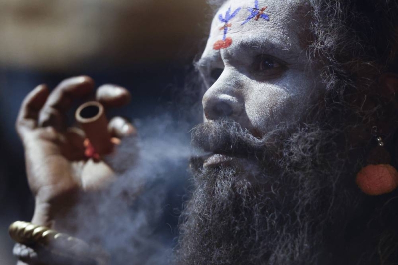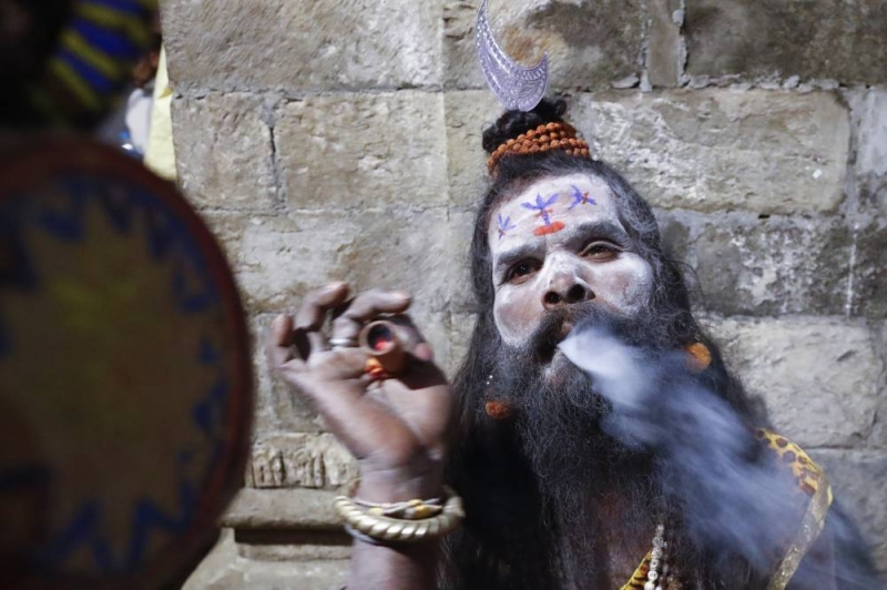 A Sadhu smokes a chillum filled with marijuana inside the premises of the Pashupatinath Temple on the eve of the Maha Shivaratri festival dedicated to Lord Shiva in Kathmandu, Nepal, on Saturday, February 14, 2026.