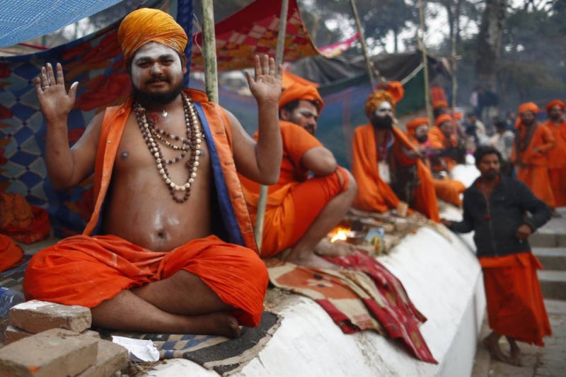 Sadhus sit inside the premises of the Pashupatinath Temple on the eve of the Maha Shivaratri festival dedicated to Lord Shiva in Kathmandu, Nepal, on Saturday, February 14, 2026.