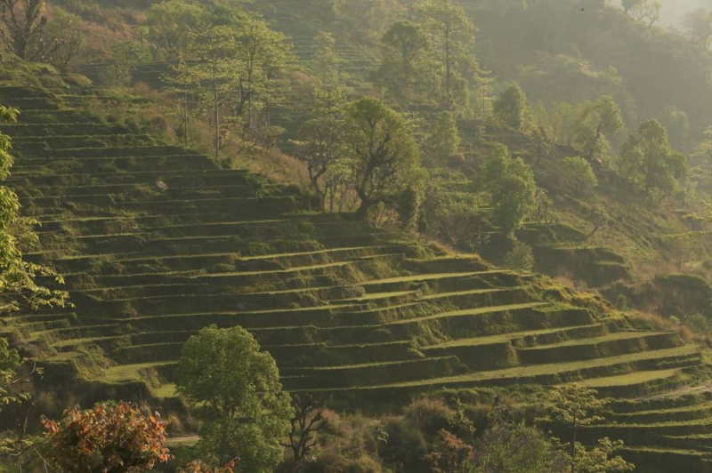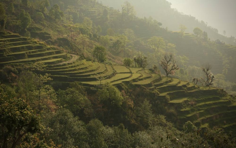 Lush green terraced fields in a Gurung village of Lamjung District, captured after the planting season in Dudhpokhari Rural Municipality–4, Gharedhunga on Friday.