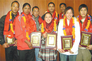 KATHMANDU: Madan Bhandari Sports Academy felicitated the 11th South Asian Games medalists here on on Tuesday. Constituent Assembly Chairman Subhash Chandra Nembang feted the Nepali medalists with letters of appreciation and garlands. "It's the collective responsibility to honour the players, who are the national treasure" said Nembang on the occasion. CPN-UML leader KP Sharma Oli, Information and Communication Minister Shanker Pokharel, Youth and Sports Minister Ganesh Nepal among others were present on the occasion. The record setting taekwondo ace Deepak Bista said the players did everything they could to make the nation proud despite numerous setbacks. "But it's pity that the government has not given sports the due importance," rued Bista who became the first South Asian players to win fourth successive gold medals in Dhaka.